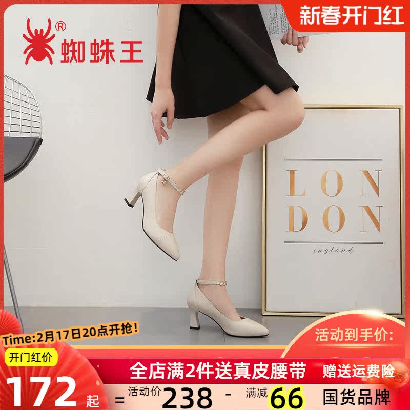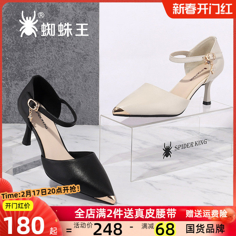蜘蛛王女鞋牛皮高跟鞋女一字带搭扣真皮尖头细跟春季新款浅口单鞋