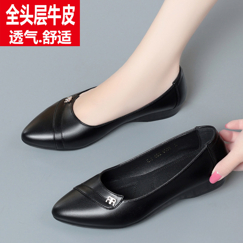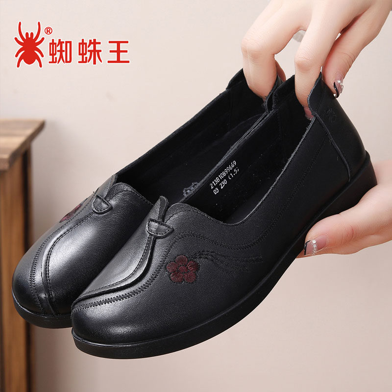 蜘蛛王女鞋秋款女士真皮浅口妈妈平底单鞋防滑中老年人舒适皮鞋