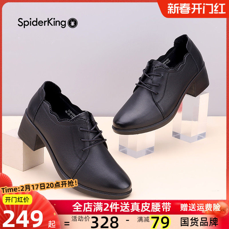 蜘蛛王女鞋深口单鞋女真皮休闲中跟春秋新款系带粗跟皮鞋女