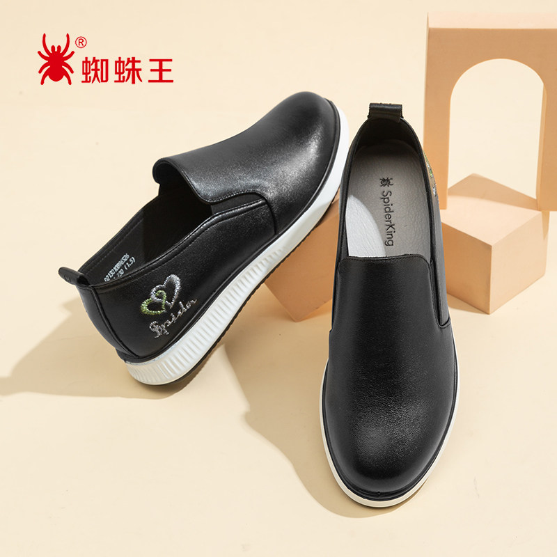 2024春季新款蜘蛛王女鞋真皮坡跟单鞋女中老年平底妈妈鞋软底皮鞋