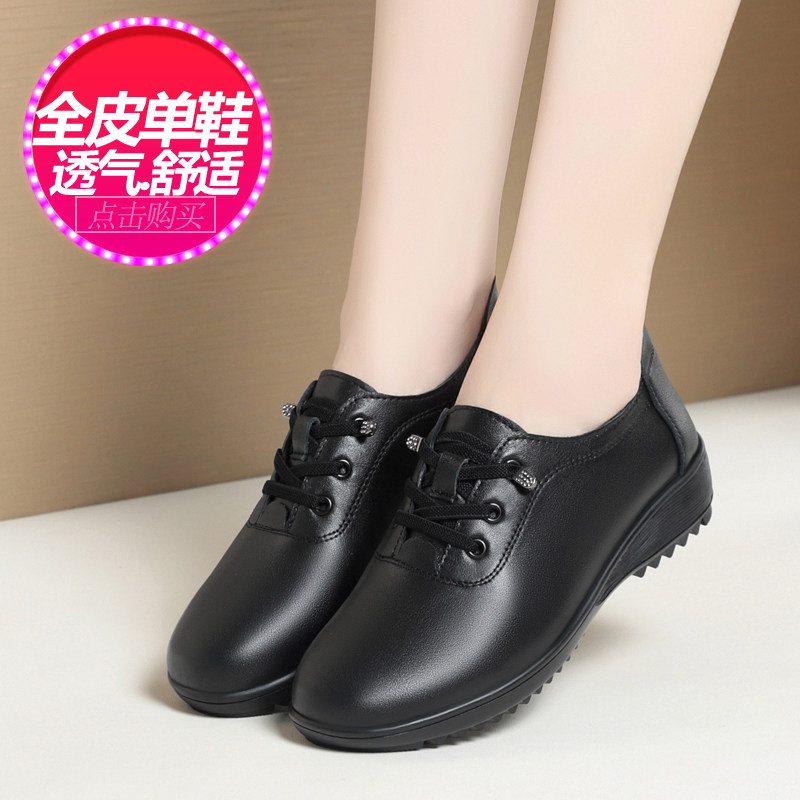 真皮单鞋女春秋新款中跟软底休闲系带皮鞋中年女士妈妈鞋深口女鞋