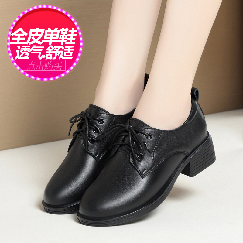 女士皮鞋真皮系带黑色鞋子软底舒适工作鞋粗跟中年妈妈鞋深口单鞋