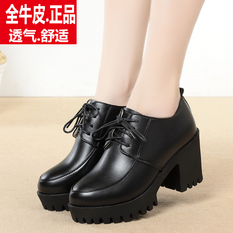 真皮女鞋深口单鞋厚底2023春秋新款高跟小皮鞋粗跟妈妈皮鞋工作鞋