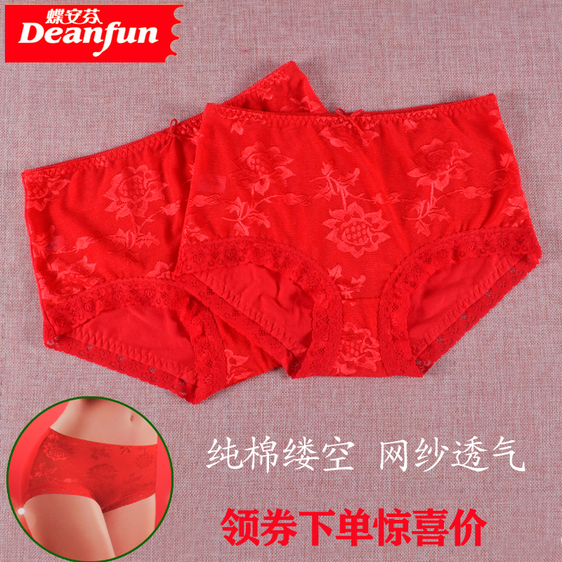 蝶安芬大红本命年纯棉女士中腰平角内裤网眼透气蕾丝花边棉质短裤