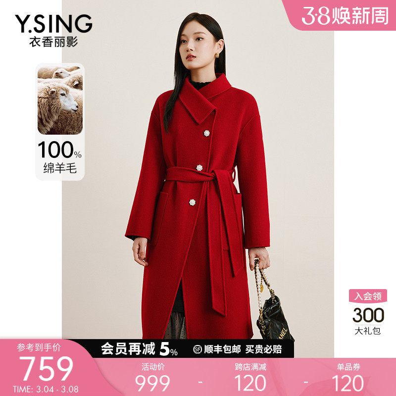 100%羊毛红色双面呢子大衣女2024年春季新款高端毛呢外套新年战袍