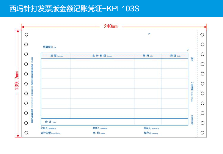 西玛KPL103S用友发票版针打金额记账凭证纸打印纸/ 241*139.7mm