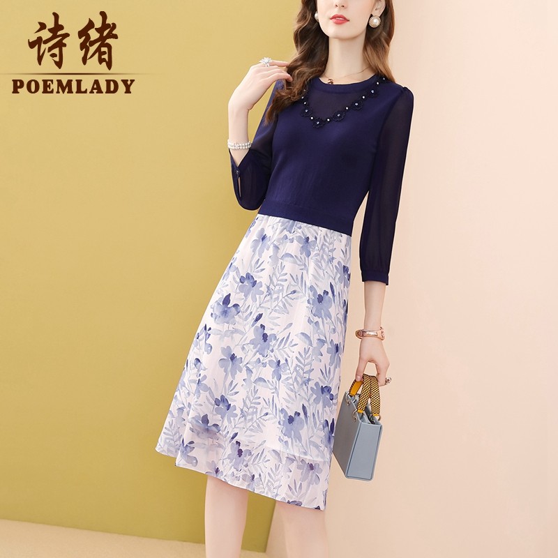 诗绪长袖针织拼接印花假两件连衣裙女2021冬新款气质显瘦56410