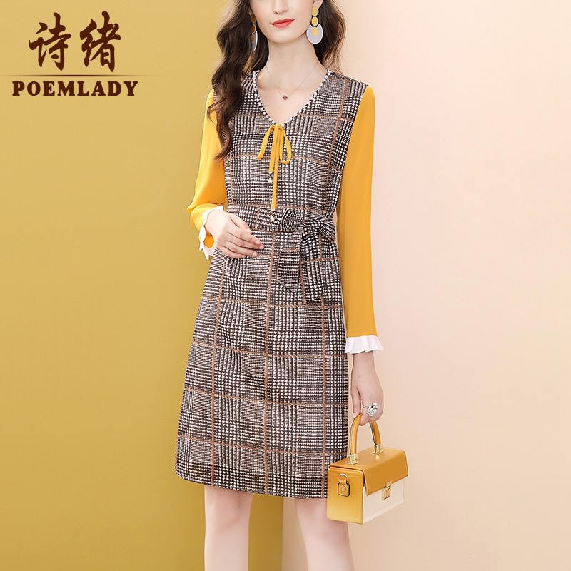 诗绪格子V领气质连衣裙女秋装2022年新款中长款长袖拼接裙子53071