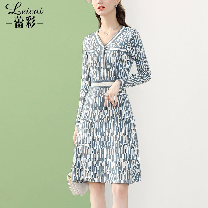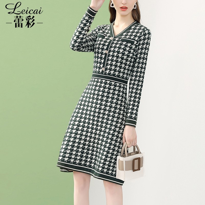 蕾彩法式V领千鸟格针织连衣裙女秋季2022新款长袖打底中长款35400