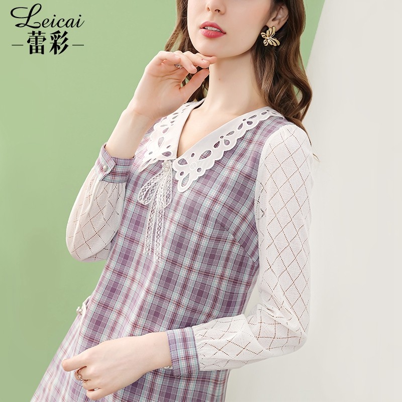 蕾彩娃娃领长袖紫色格子连衣裙女秋季2022新款宽松短款裙子35363