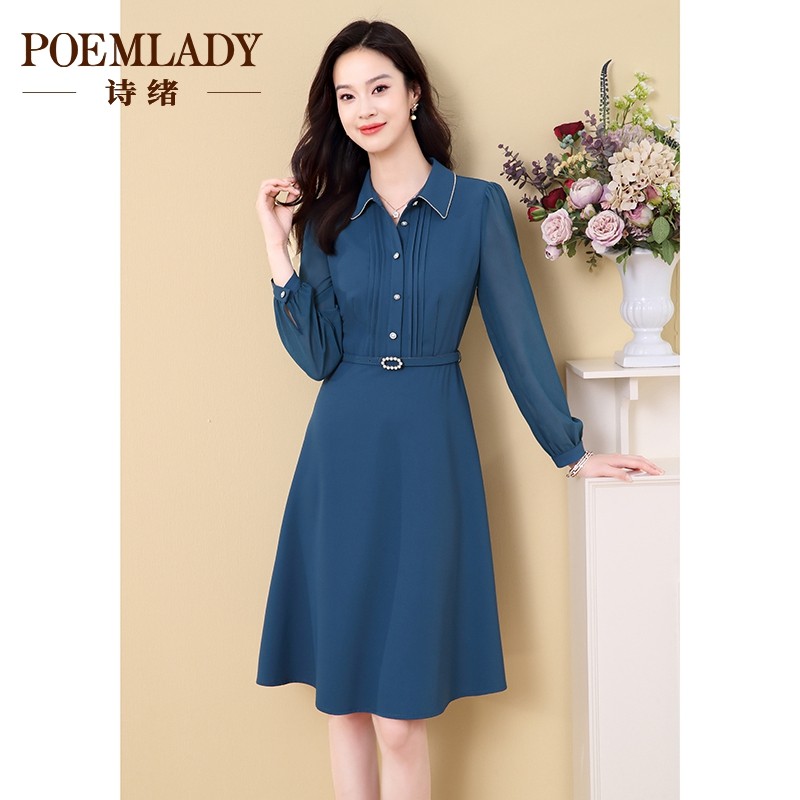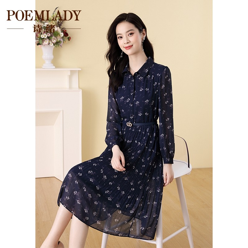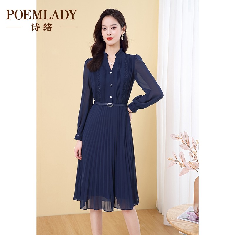 诗绪藏蓝色长袖雪纺百褶连衣裙女2023秋季新款收腰中长气质62815