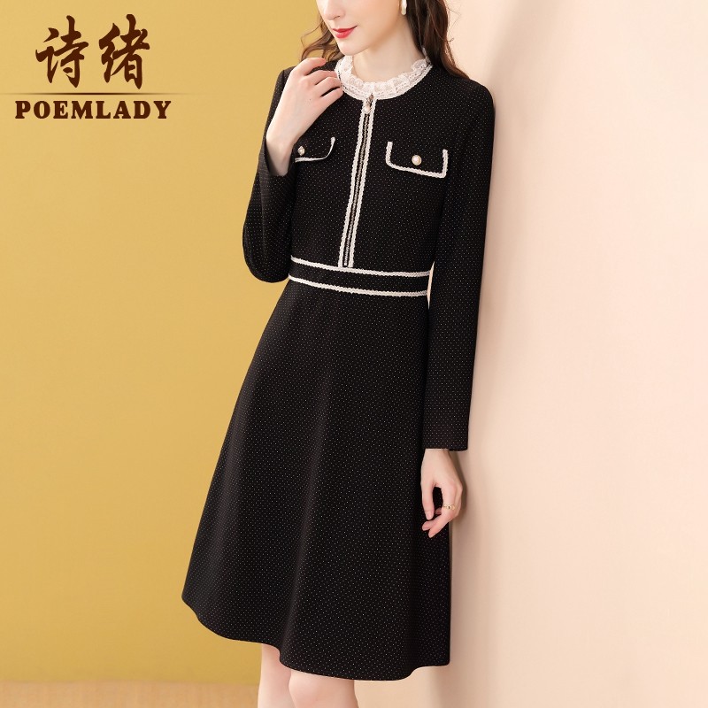 诗绪洋气优雅黑色收腰显瘦长袖连衣裙女2021秋冬新款小个子57352