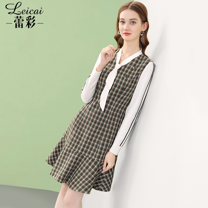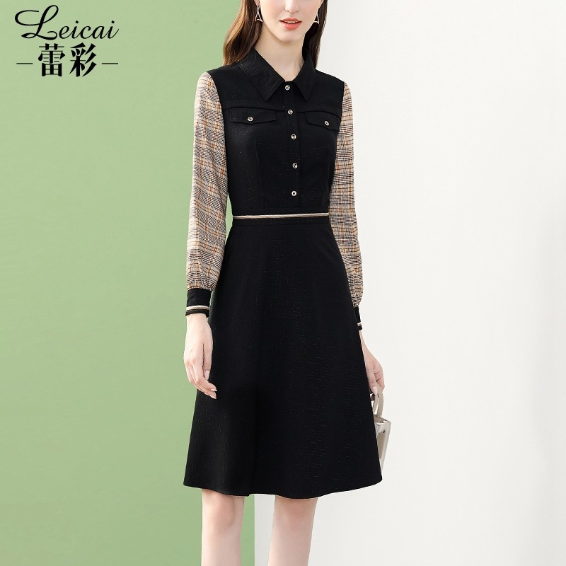 蕾彩法式长袖格子小香风连衣裙女冬季2021新款中长款打底裙35537