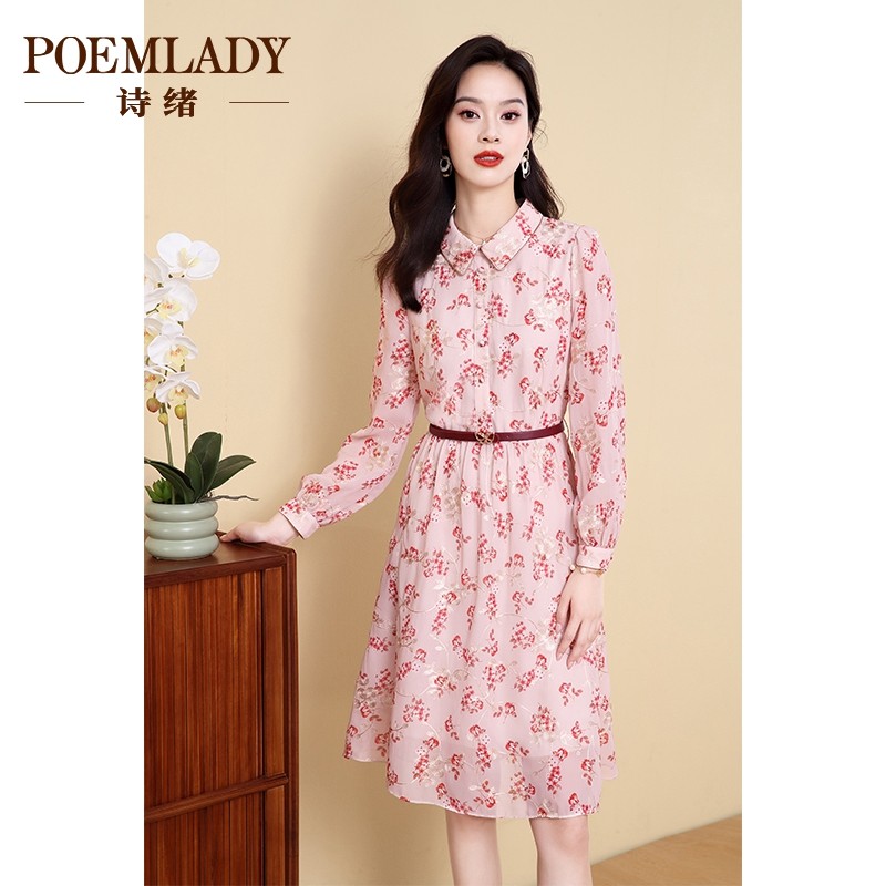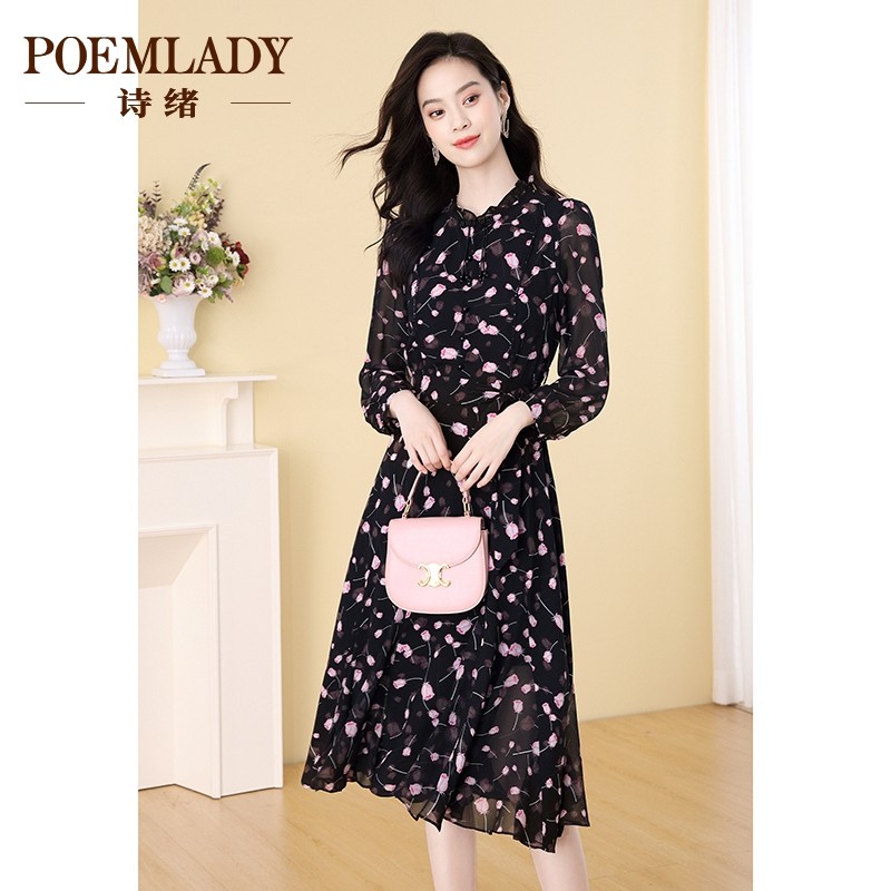 【绣花】诗绪衬衫领印花雪纺连衣裙女秋季2023新款长袖中裙62854
