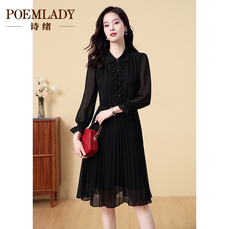 诗绪长袖衬衫领黑色雪纺百褶连衣裙女秋季2023新款通勤时尚62733
