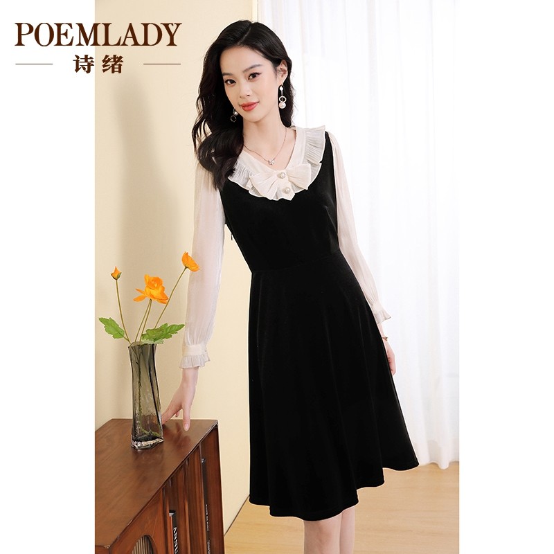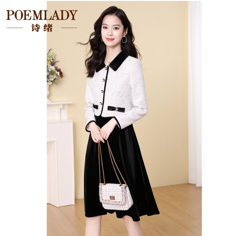 诗绪小香风拼接丝绒假两件连衣裙女秋冬季2023新款长袖中裙63470