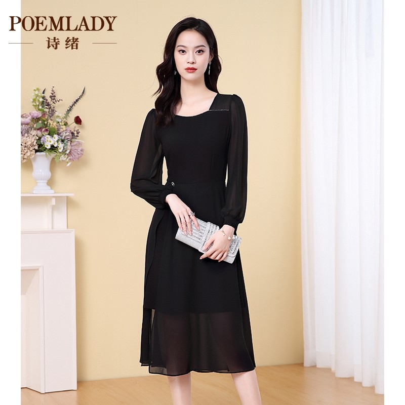 诗绪黑色方领雪纺垂坠感连衣裙女2023秋季新款长袖中长裙子62738