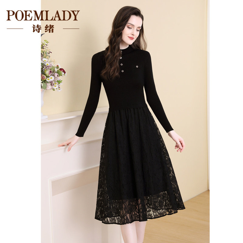 诗绪长袖半高领拼接假两件修身针织连衣裙2021秋冬新款气质57515