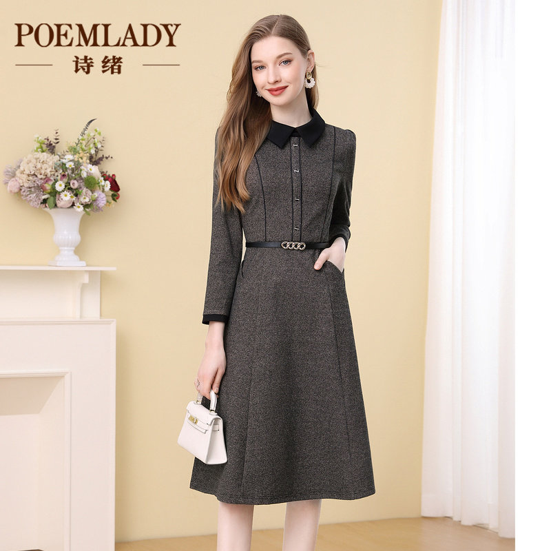 诗绪衬衫领含羊毛假两件连衣裙女秋冬季2023新款长袖中长裙63435