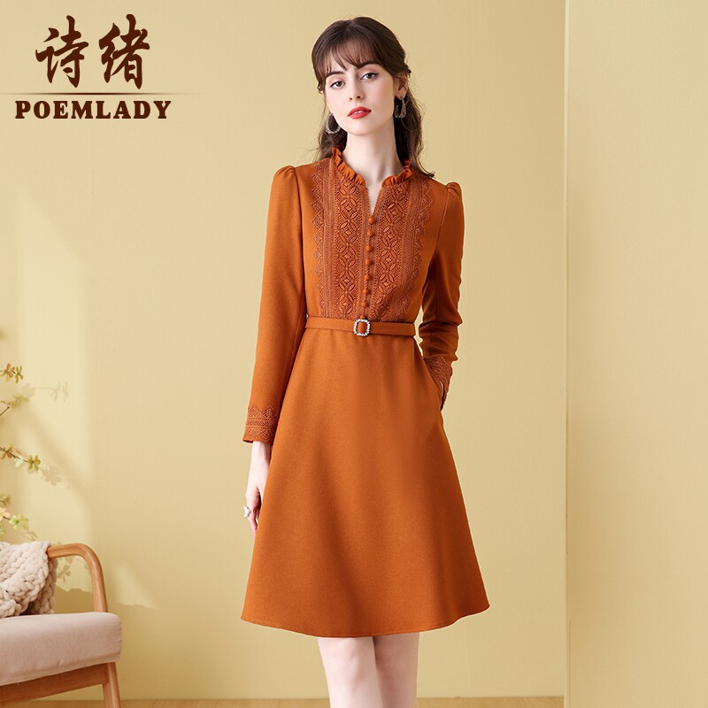 诗绪时尚优雅橙色长袖修身显瘦连衣裙女2022年秋冬新款收腰60883