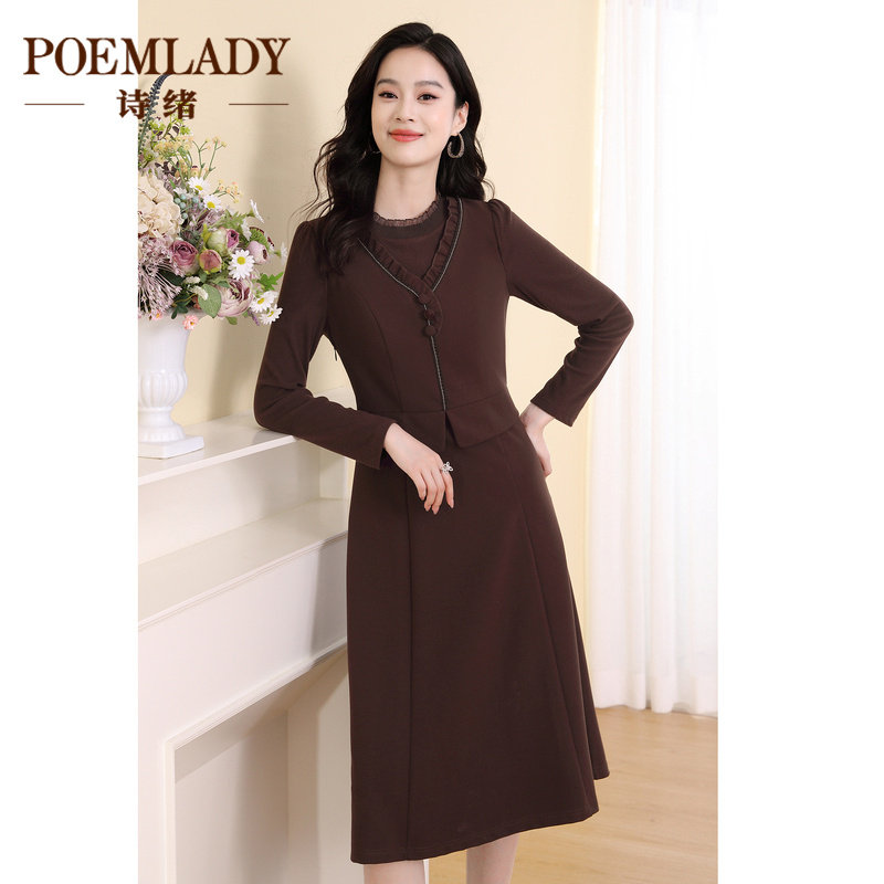 诗绪复古咖色针织拼接假两件连衣裙女冬季2023新款长袖中裙63499