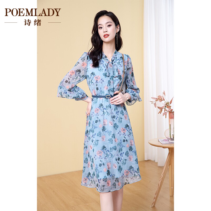 诗绪蓝色飘带领印花雪纺连衣裙女2023秋季新款收腰显瘦长袖62787