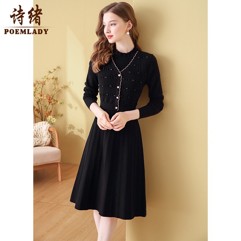 诗绪气质打底长袖黑色针织连衣裙女2022秋冬新款中长假两件61038