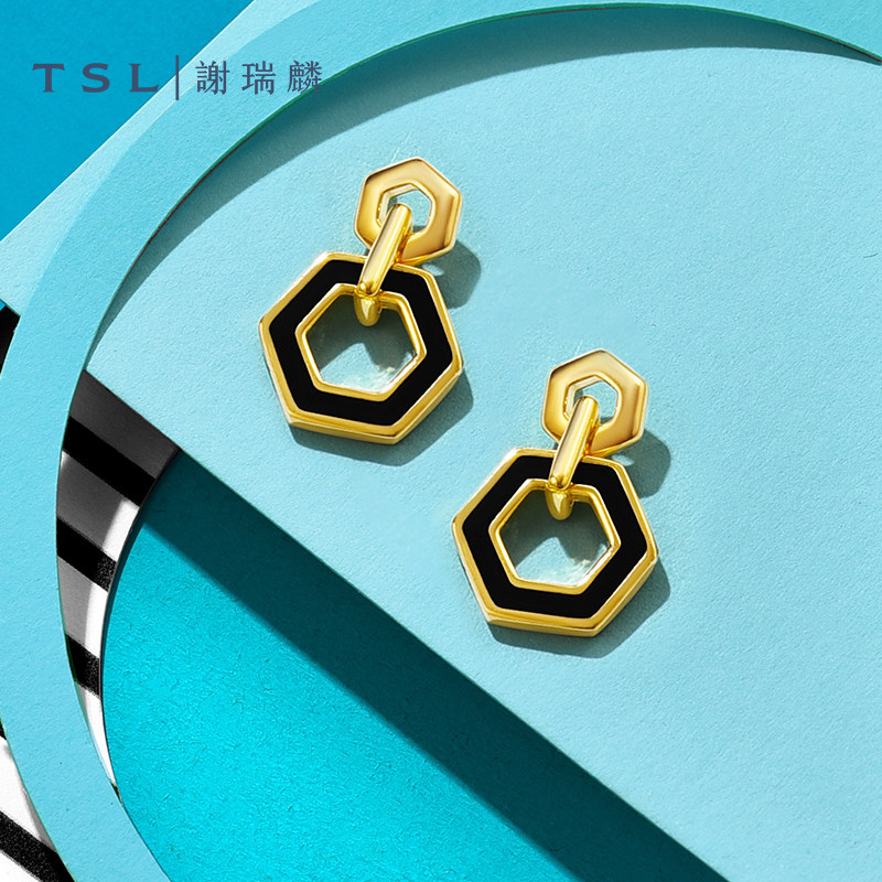 TSL谢瑞麟蜂巢系列18K金耳环镶嵌黑玛瑙六边形耳饰女新品AH283