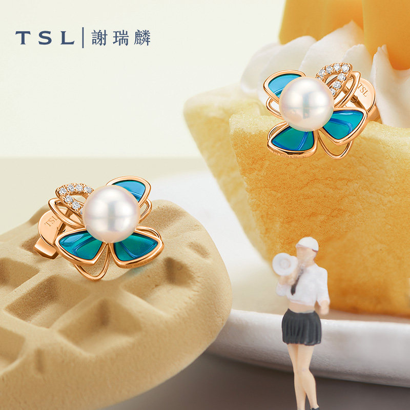 TSL谢瑞麟透明珐琅珍珠系列18K金钻石耳钉女士花瓣耳饰一对BD024