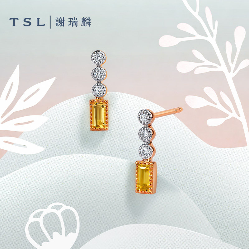 TSL谢瑞麟炫彩系列18K金钻石耳钉镶嵌方形黄水晶耳饰耳环女BD483