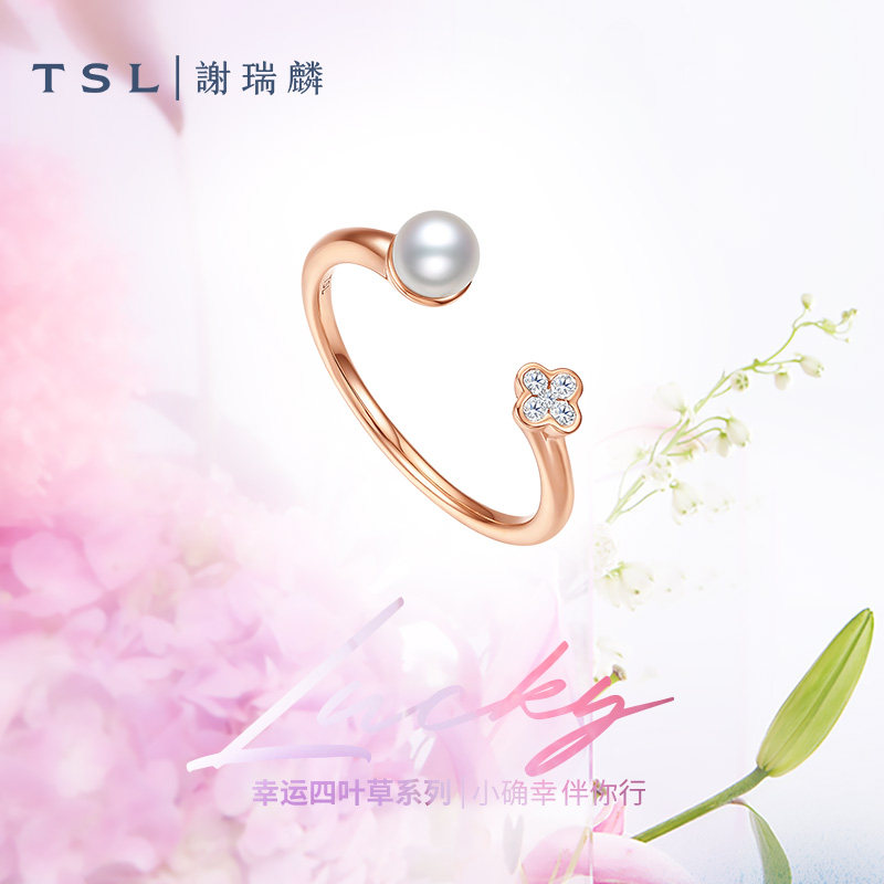 TSL谢瑞麟18k金戒指四叶草钻石戒指开口玫瑰金珍珠BC843