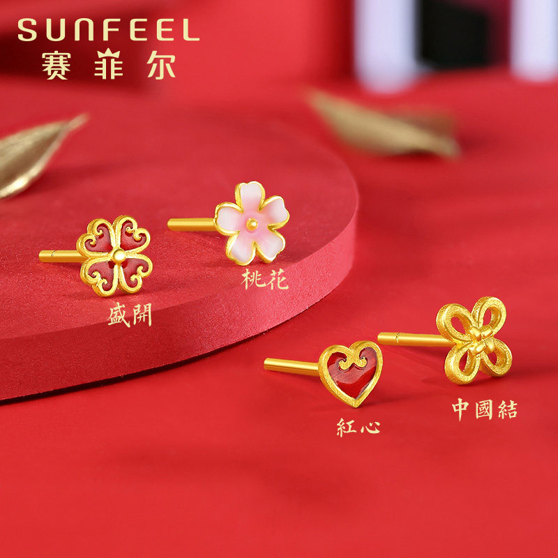 赛菲尔黄金耳钉足金999.9国潮珐琅百搭耳饰耳环桃花送女生礼物