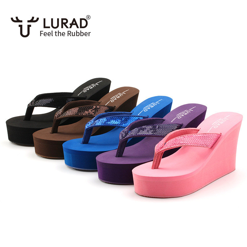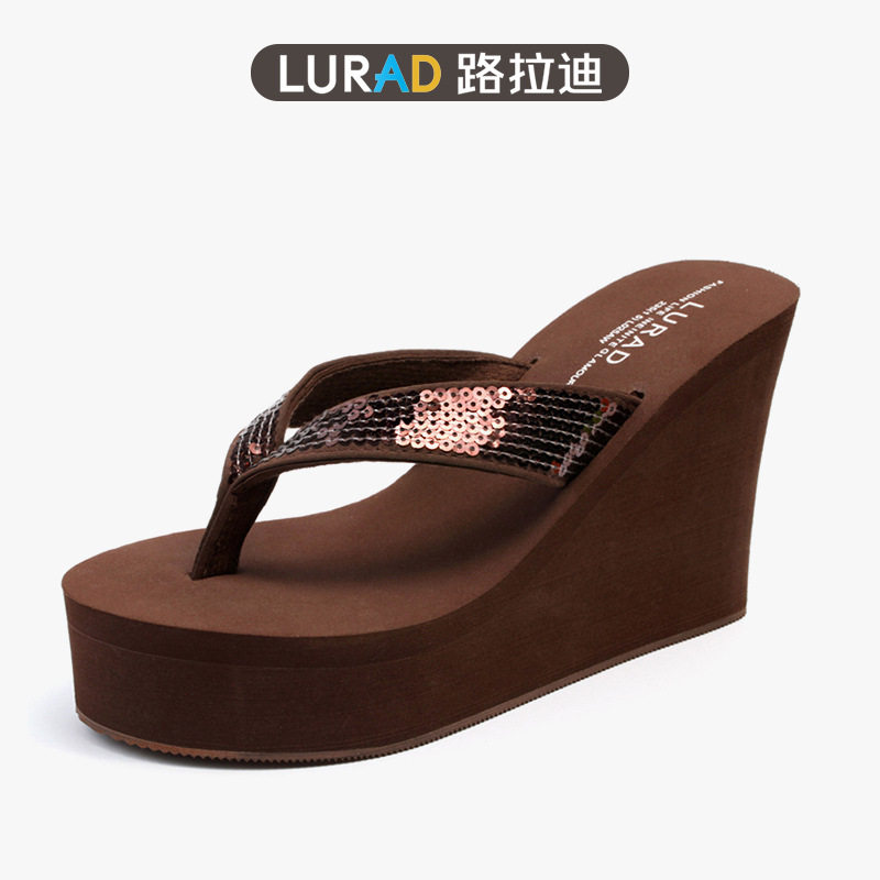 路拉迪亮片超高跟人字拖鞋女士夏季松糕坡跟厚底防滑沙滩凉拖鞋