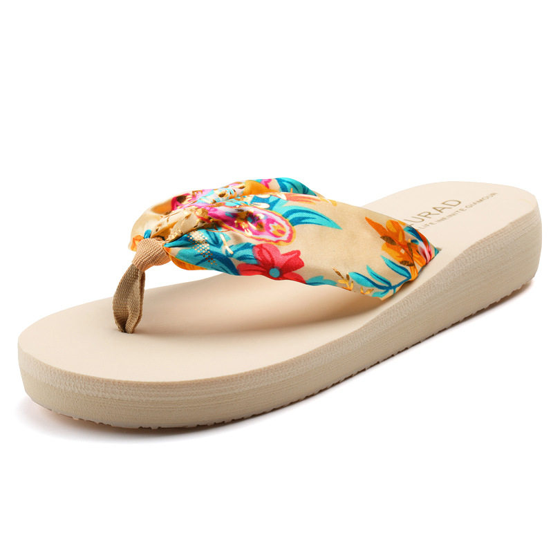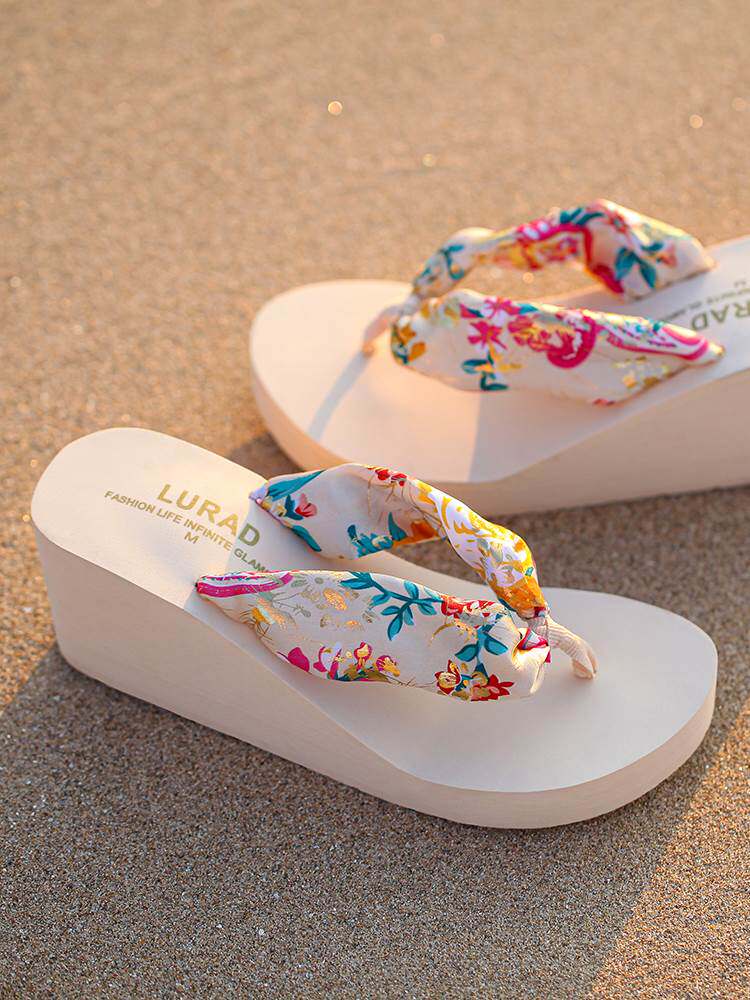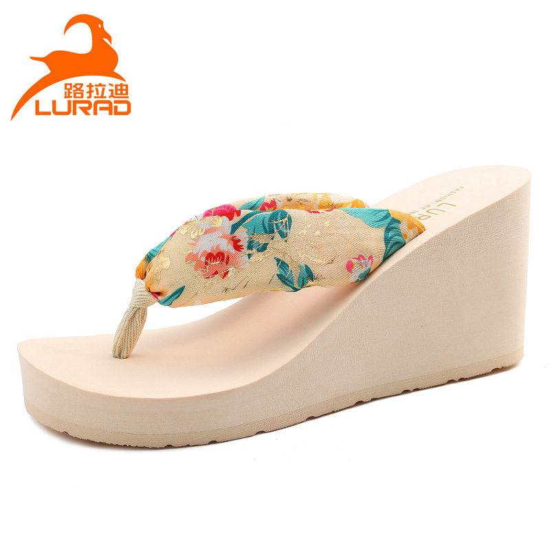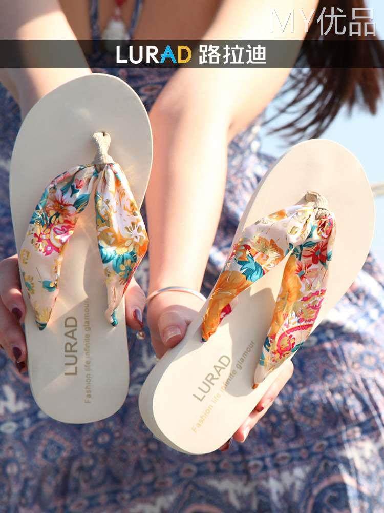 路拉迪波西米亚丝绸人字拖夏季坡跟厚底防滑高跟沙滩女士凉拖鞋韩