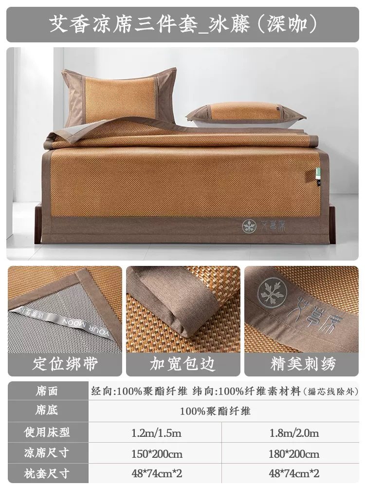 远梦家纺艾草冰藤席夏季冰丝凉席三件套可水洗折叠席空调双人床席