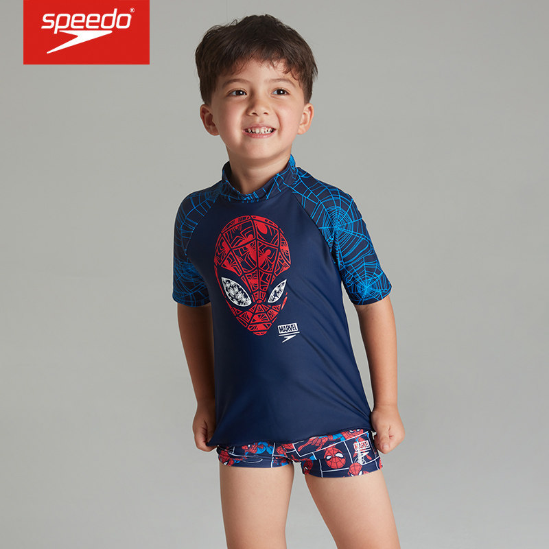 Speedo速比涛迪士尼蜘蛛侠印花男童防晒衣短袖温泉分体套装泳衣