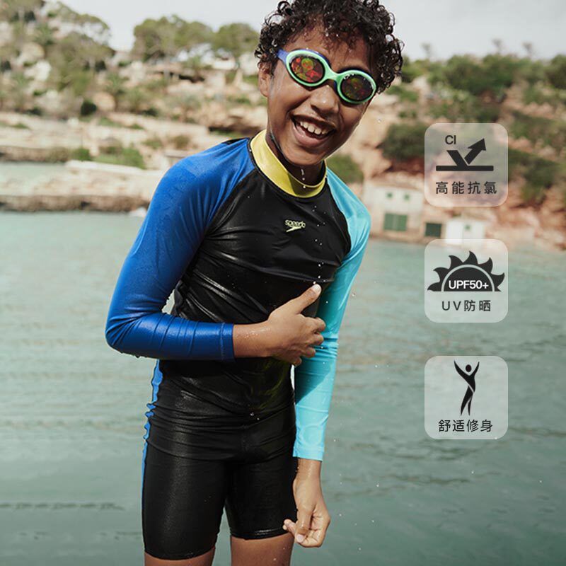 speedo速比涛儿童分体泳衣防晒长袖上衣中大童青少年男孩温泉套装