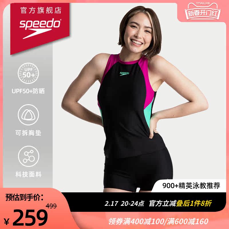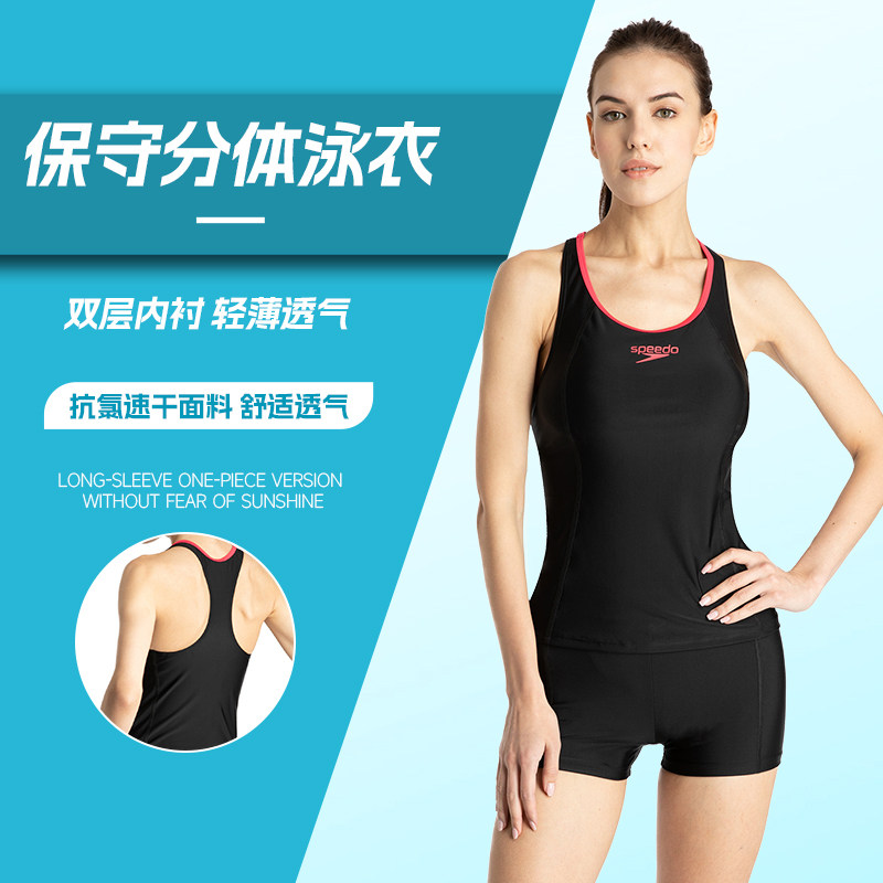 Speedo速比涛分体泳衣女保守平角防晒遮肚显瘦专业抗氯泳装23新款