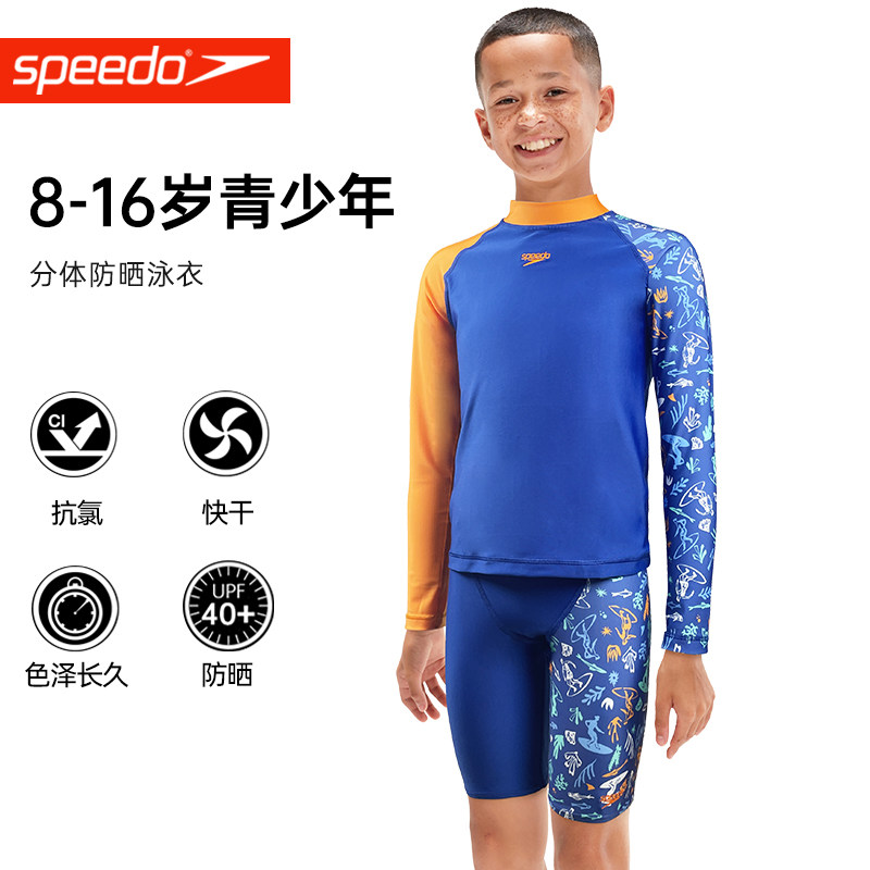 Speedo速比涛男童泳衣 青少年印花抗氯防晒长袖分体泳衣泳裤套装