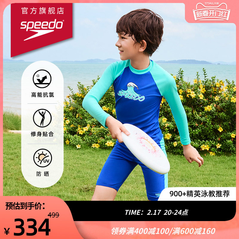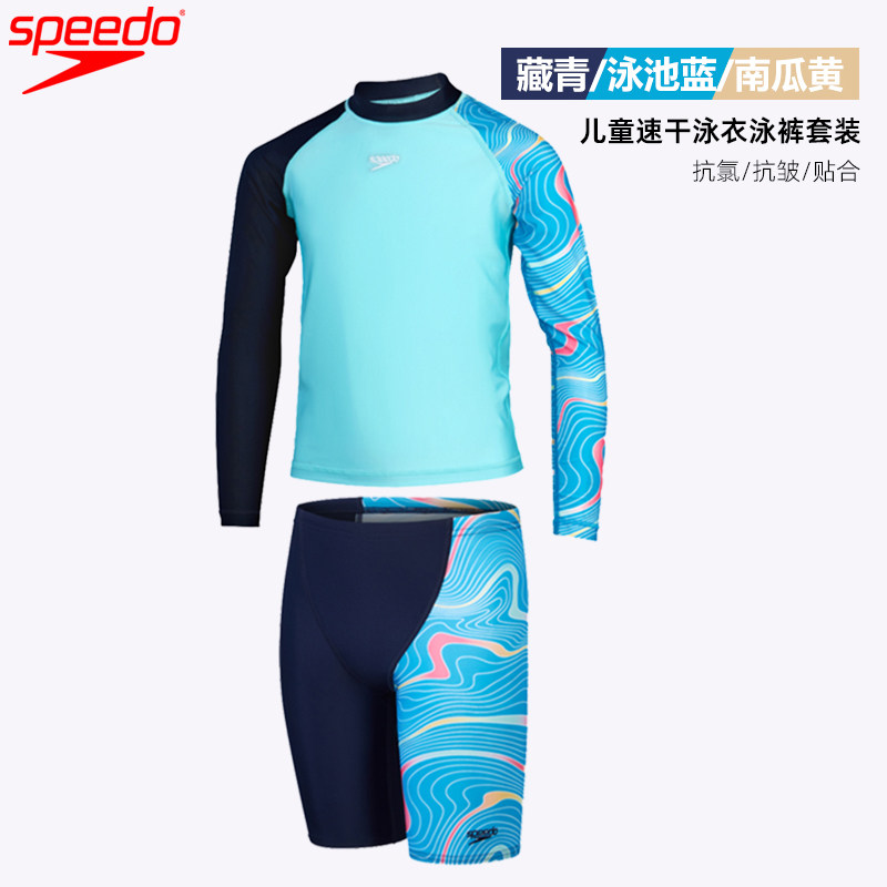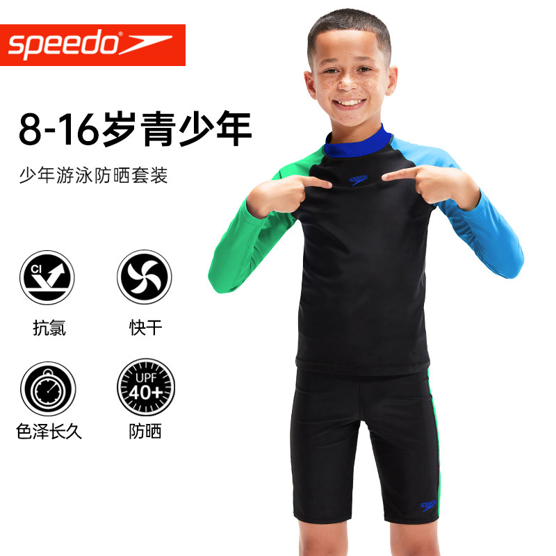Speedo速比涛儿童泳衣长袖防晒快干青少年男孩分体泳衣泳裤套装