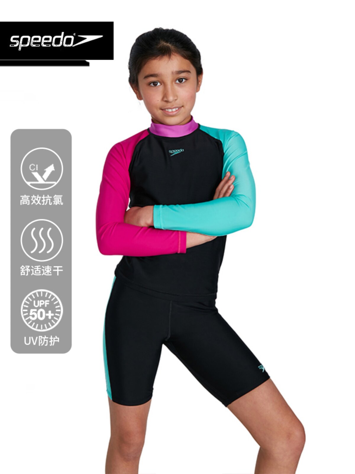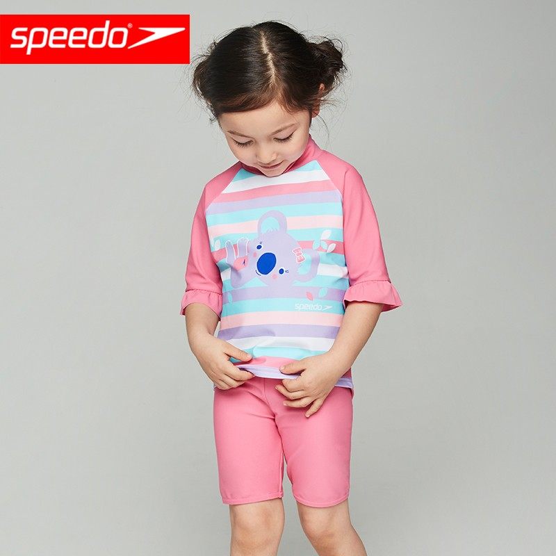Speedo/速比涛儿童泳衣女童长袖防晒分体及膝泳裤套装温泉度假