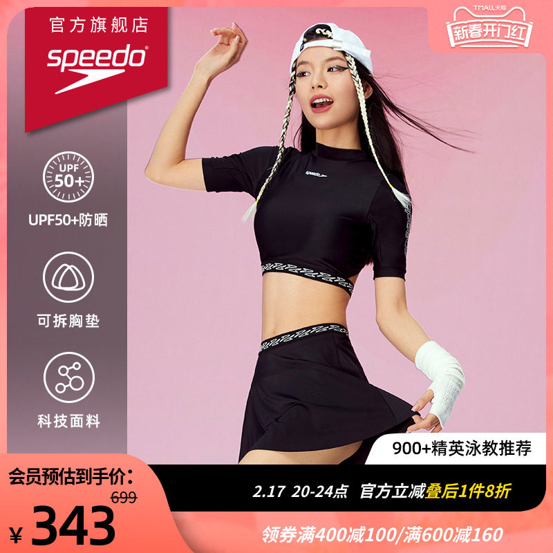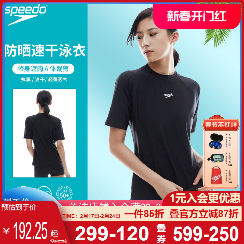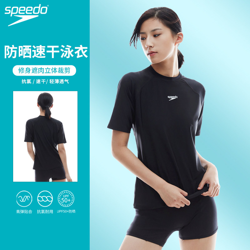 speedo速比涛半袖分体泳衣女夏遮肚显瘦温泉防晒抗氯连体游泳装女