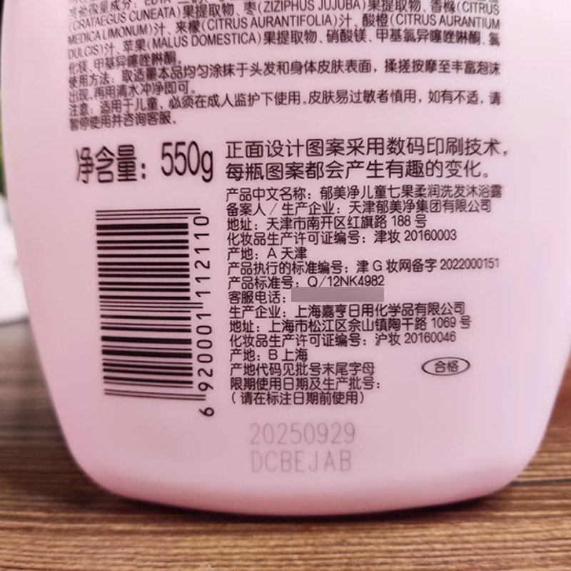 郁美净七果儿童洗发水宝宝沐浴露二合一婴儿头膏官方品牌正品国货