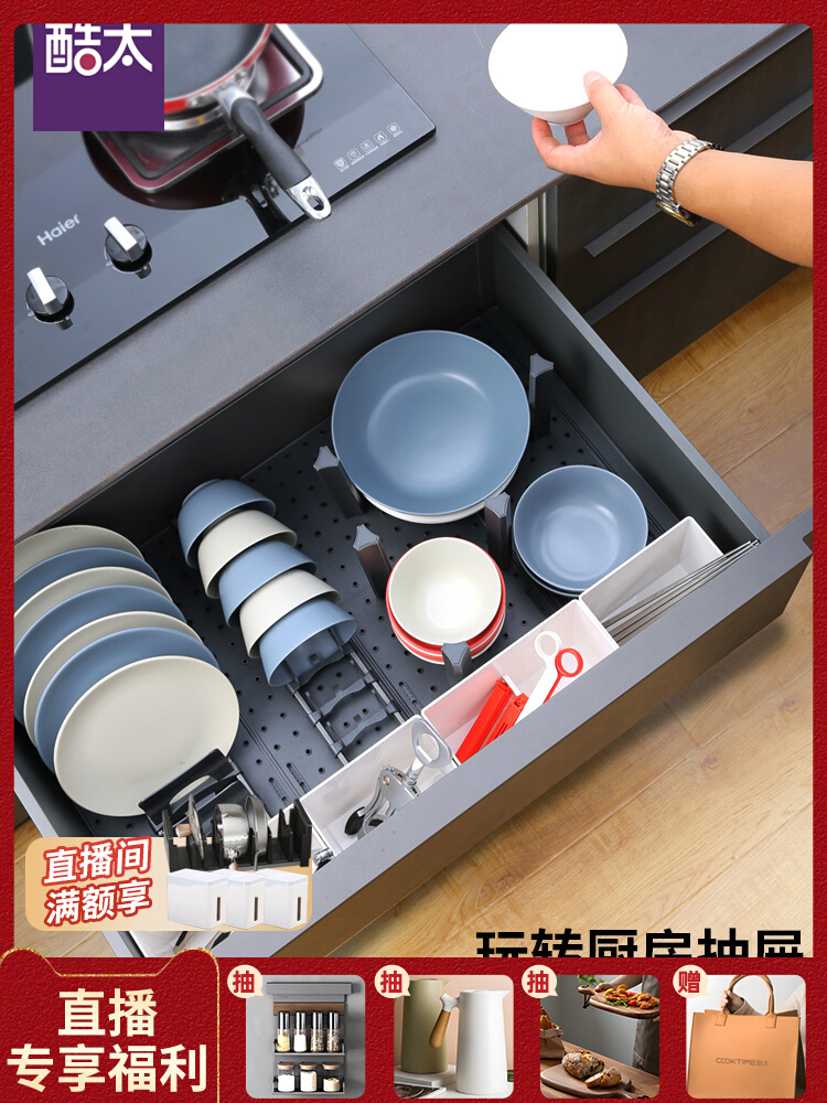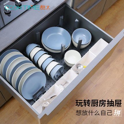 酷太厨房抽屉收纳餐具分隔整理橱柜用品锅碗分格式置物碗碟放碗架
