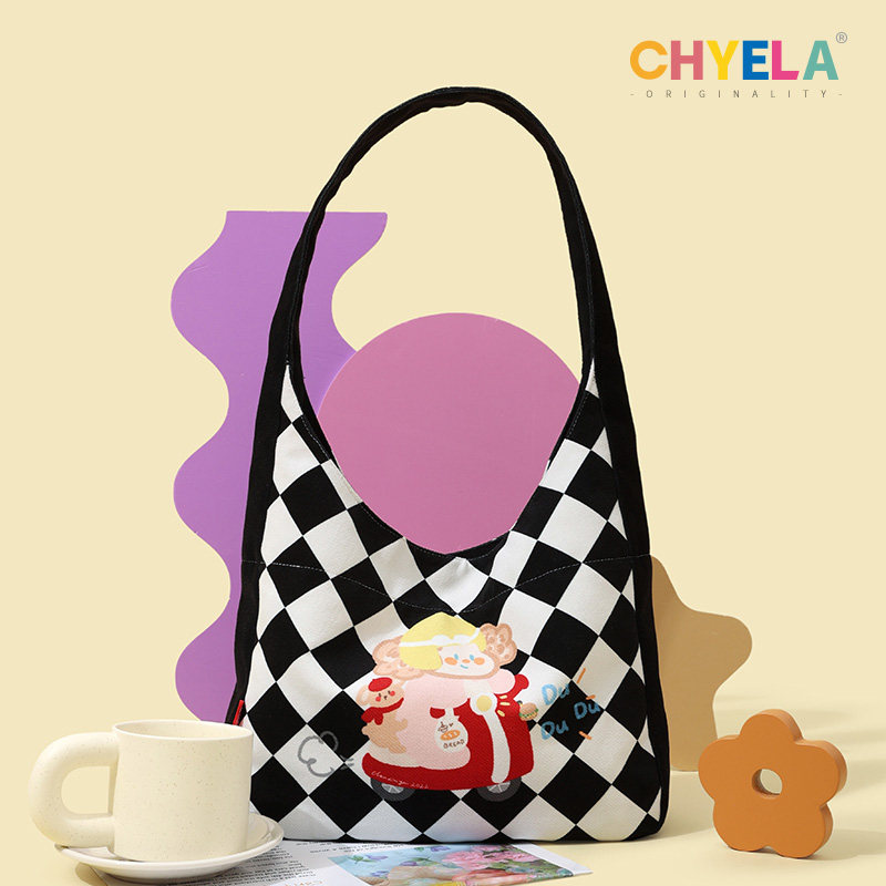 胖公主原创棋盘格单肩包大容量可爱熊猫帆布包女定制手提袋AS233