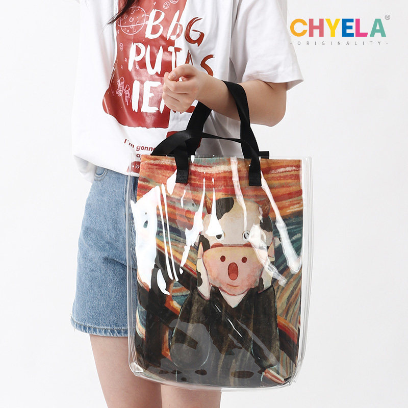原创插画奶牛呐喊手绘果冻包透明帆布袋子环保购物袋来图定制QT39