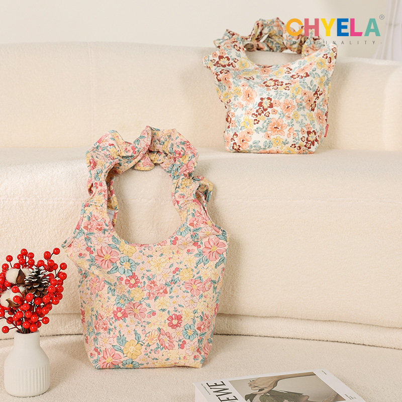 颜二两新款复古碎花荷叶边布袋法式印花手提单肩包帆布袋女QT574
