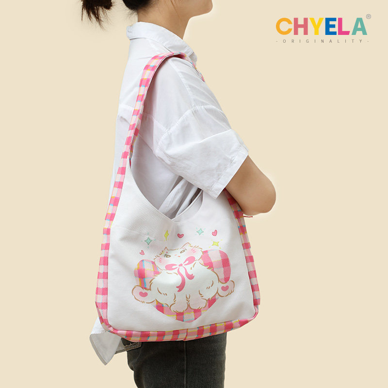 采绎来xpurrpurr车车可爱猫咪粉红格单肩包可爱小清新帆布包QT350