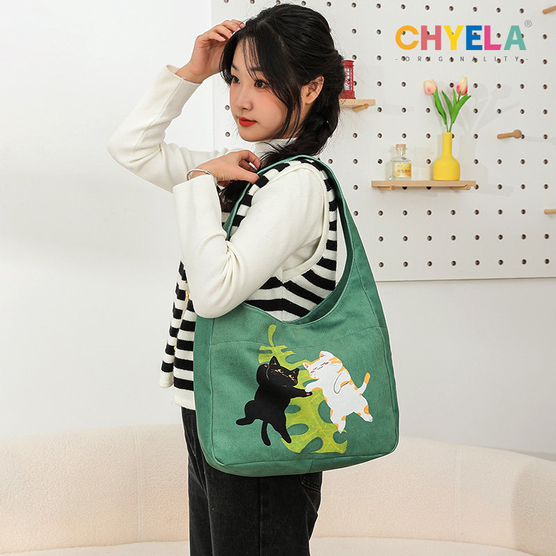 可爱猫咪插画单肩包 绿色帆布包便携大容量学生包休闲通勤包QT745