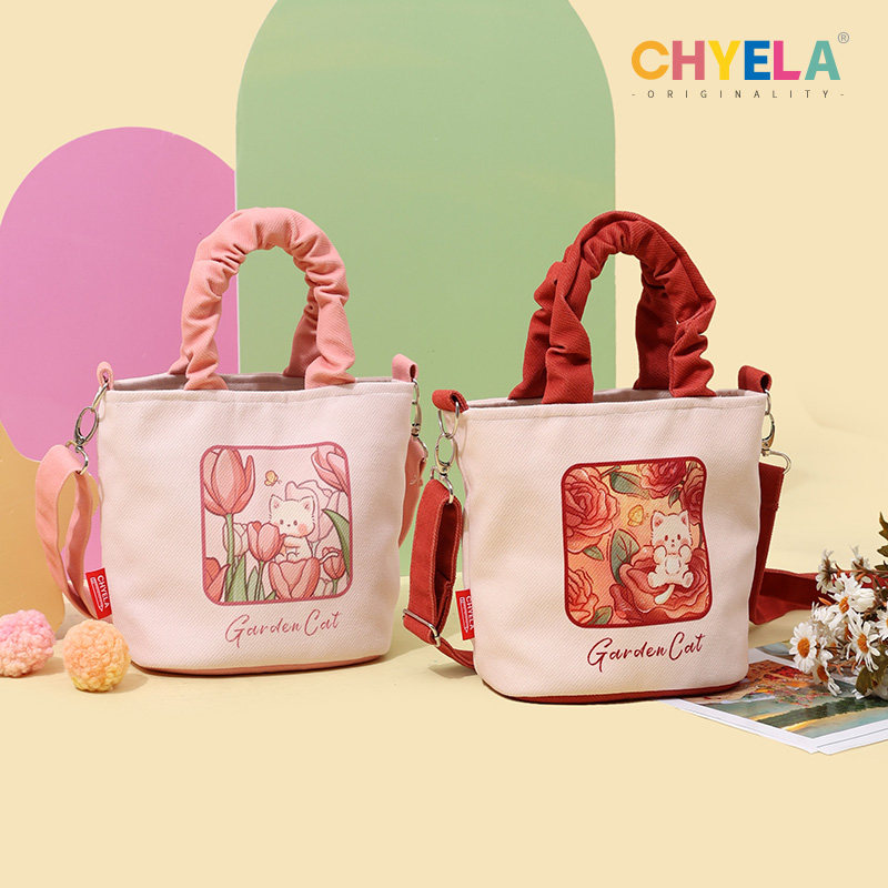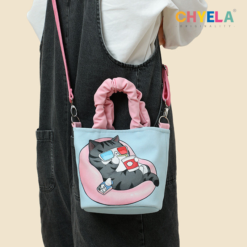 设计师原创可爱猫咪插画水桶包小众个性手拎斜跨包包女帆布袋AM32